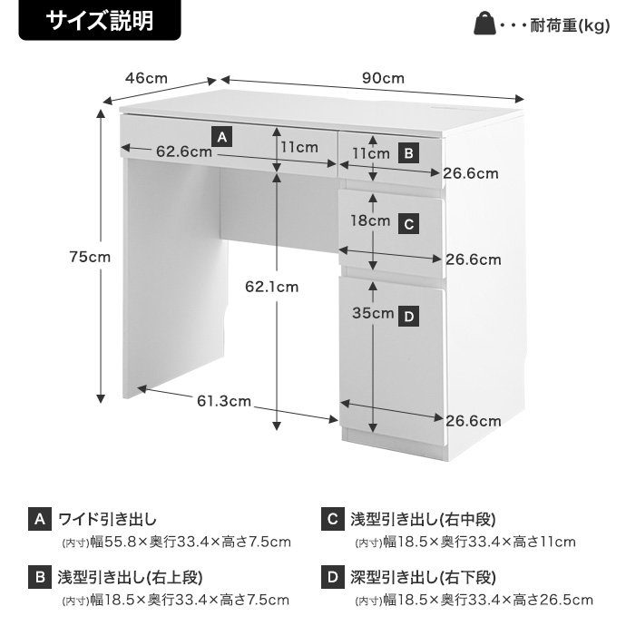 【耐荷重】天板:約20kg、ワイド引き出し:約3kg、浅型引き出し:各約3kg、深型引き出し:約5kg