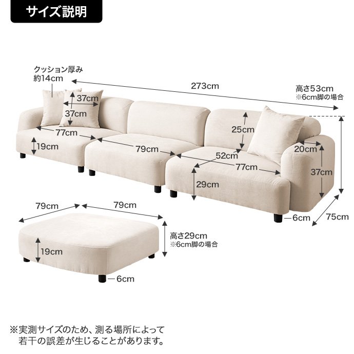 | サイズ・容量 | 【1人掛けソファ】幅79cm×奥行75cm×高さ53cm(座面高:29cm) 【コーナーソファ】幅97cm×奥行75cm×高さ53cm(座面高:29cm) 【オットマン】幅79cm×奥行79cm×高さ29cm 【1.5cm脚】24.5cm/【6cm脚】29cm/【10cm脚】33cm |