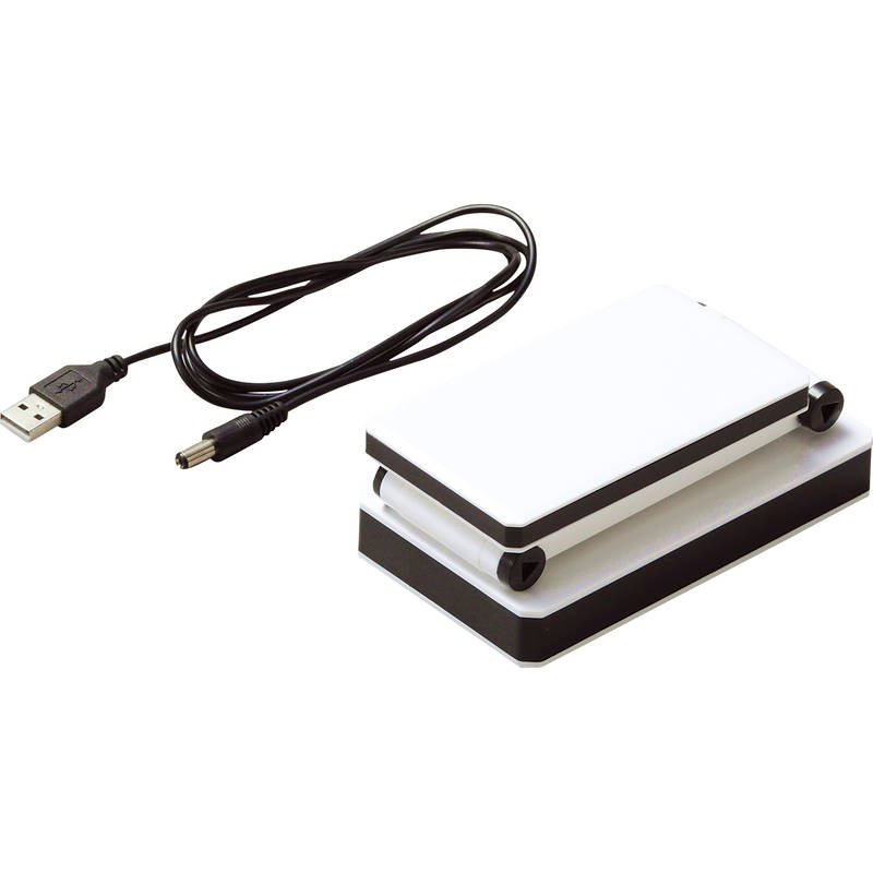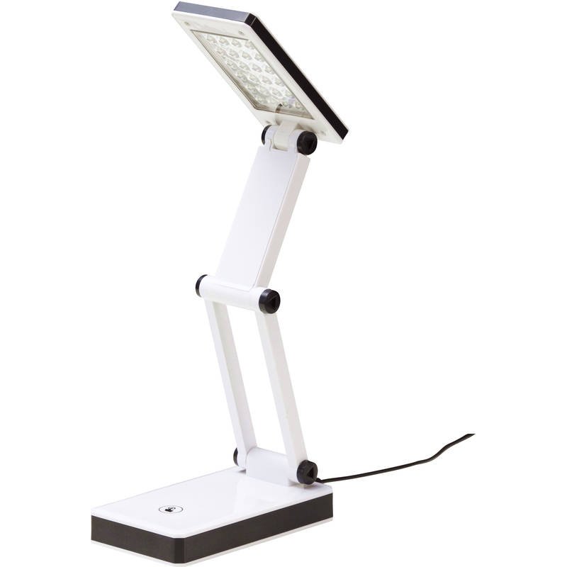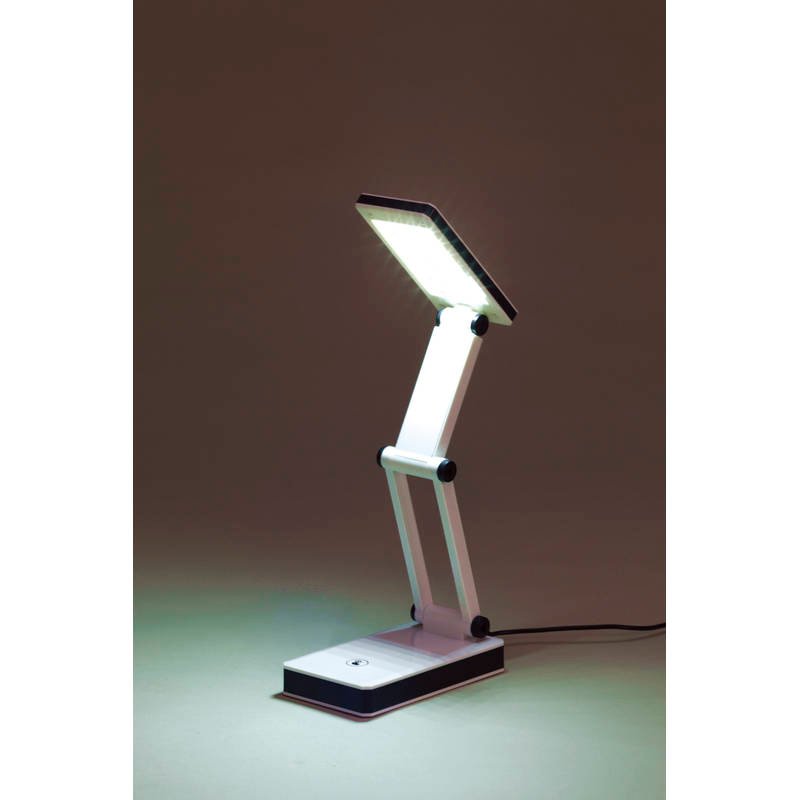 コンパクトに折りたたみ可能なLED電気スタンド 乾電池とUSB電源いずれかで使用可能。