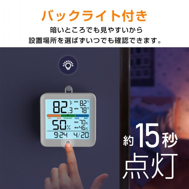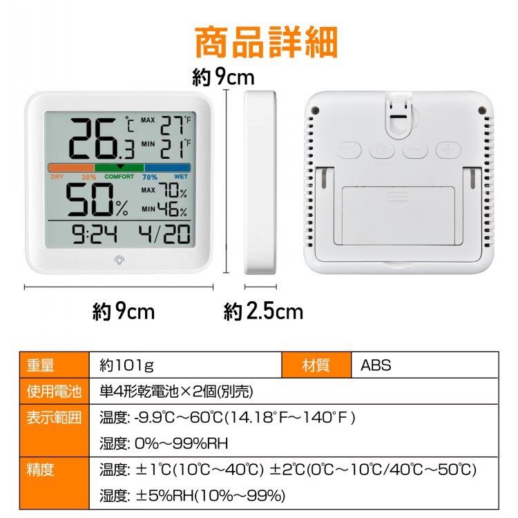 | サイズ・容量 | 【商品内容】:デジタル温湿度計 【サイズ】:(約)9cm×2.5cm×9cm 【重量】:(約)101g 【材質】:ABS 【電源】:単4形乾電池×2個(別売) |