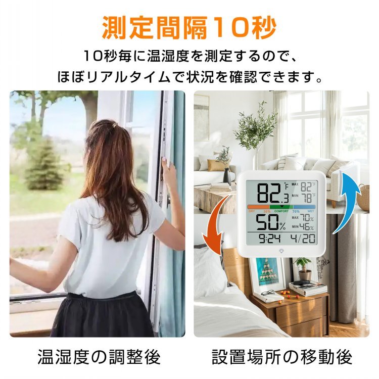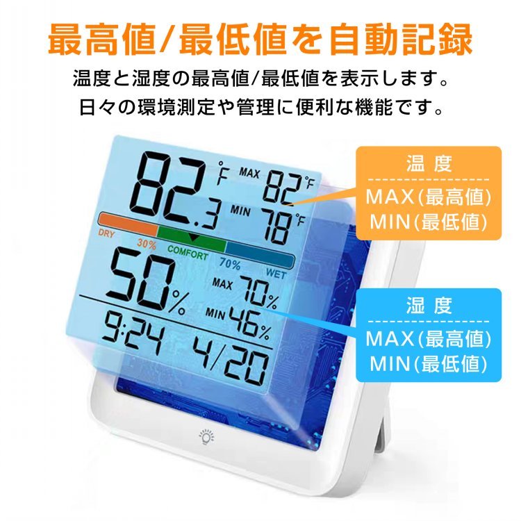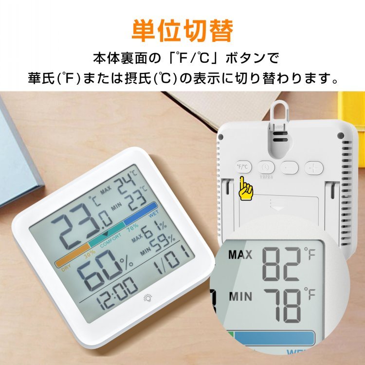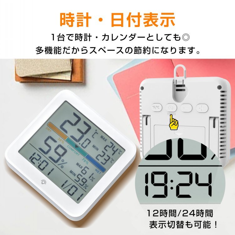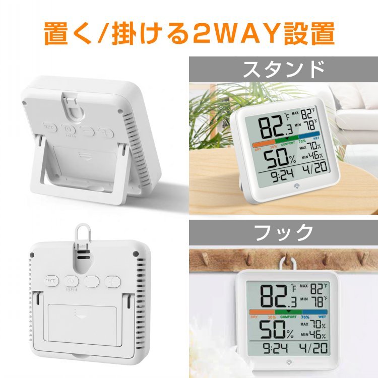 デジタル湿度計 温度計 時計 カレンダー 液晶 大画面 バックライト 卓上 壁掛 スタンド フック 小型 電池式