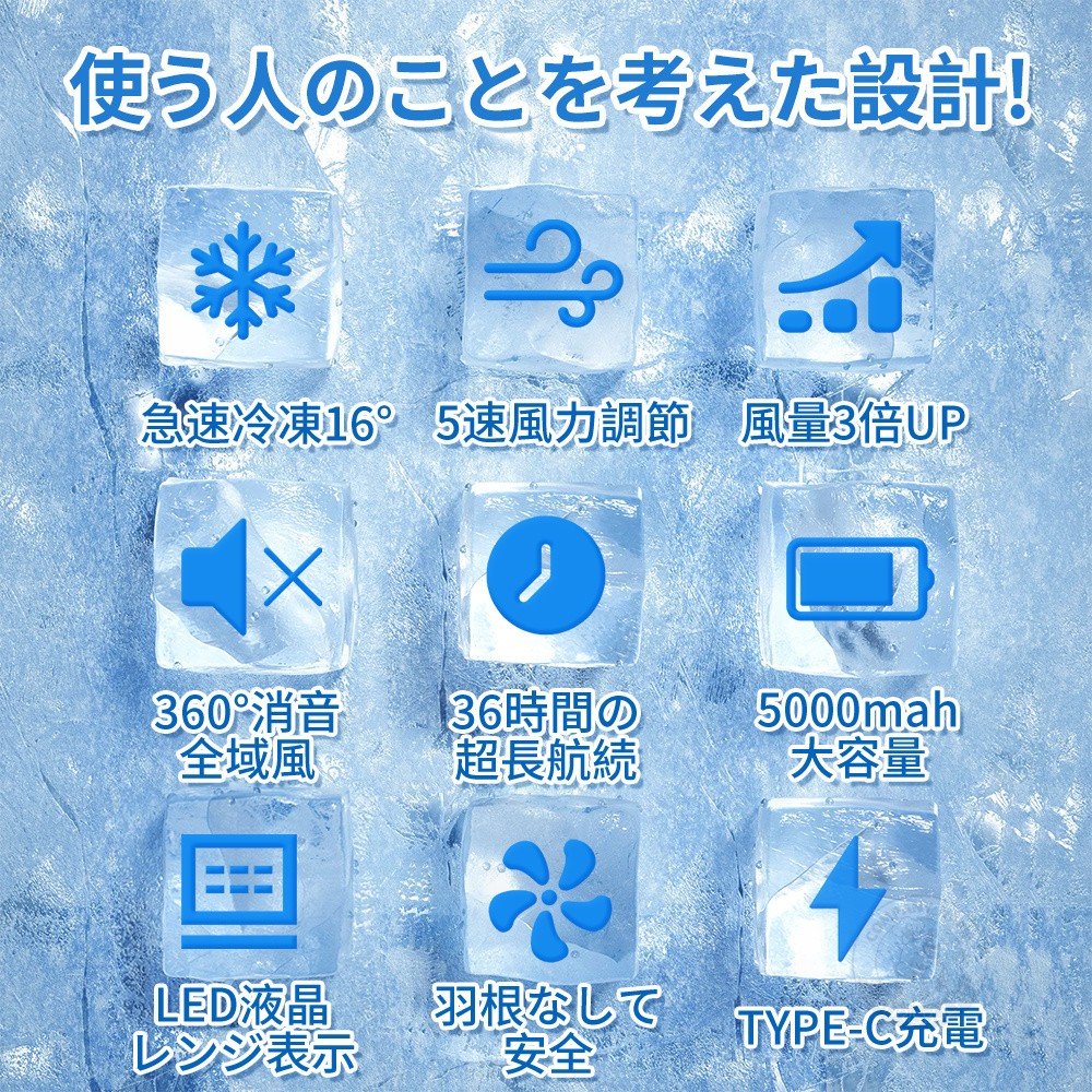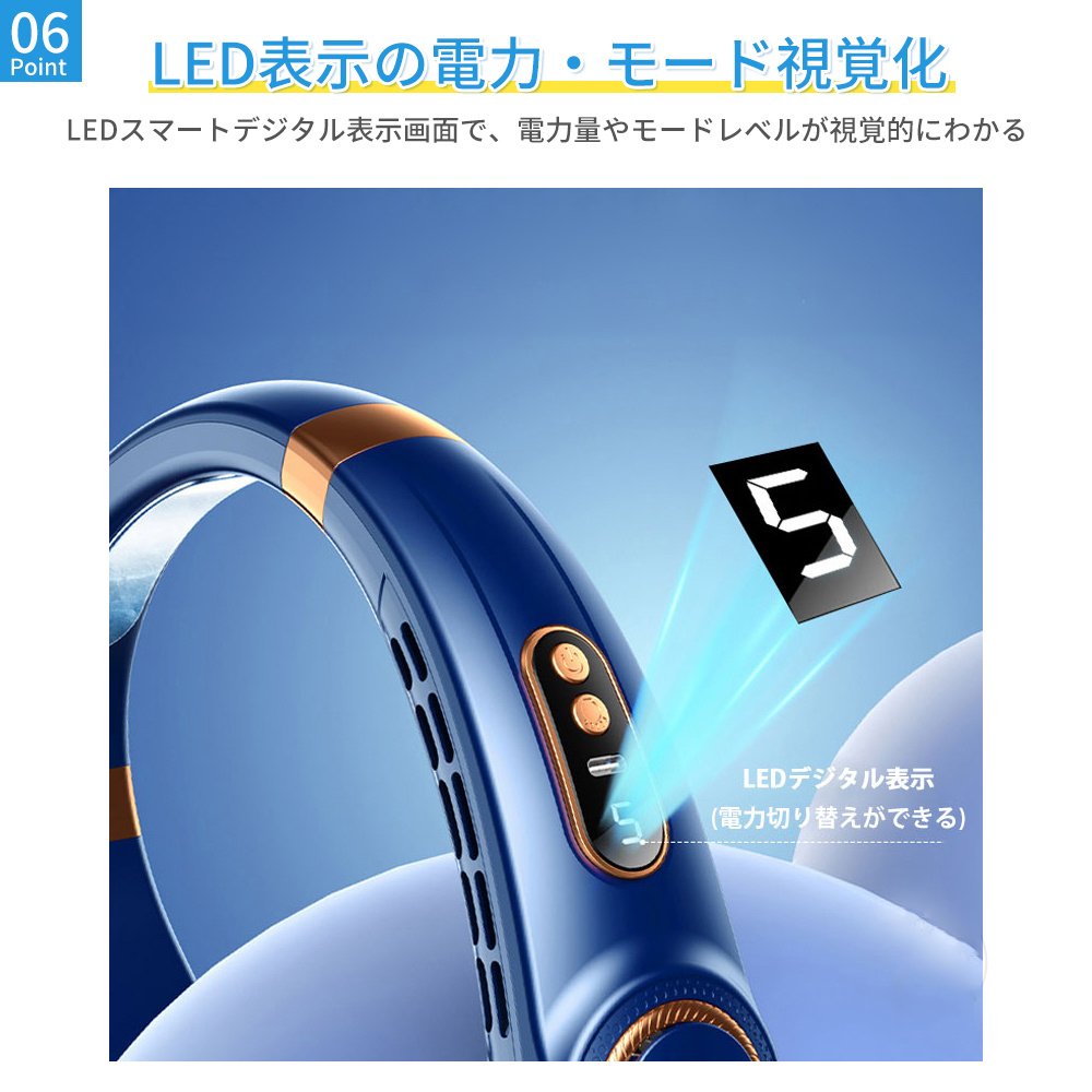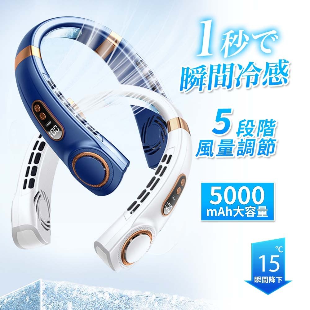 サイズ・容量 重さ:約425g 素材:ABS樹脂、アルミニウム 電池容量:5000mAh 風量:5段階 サイズ:約220*203*55mm 電池充電時間:約3~5時間 カラー:ホワイト、ブルー、ブラック、ピンク 【2023最新設計&羽なし】ネッククーラーと首掛け扇風機のぶつかり合い、「エアコン」を携帯するような、いつでもどこでも涼しさが満喫できます。 【安全性進化】 実用性と安全性を重視した設計では、指が入る隙間がなく、事故を防ぐことができます。お子さまやご高齢の方でも安心してお使いいただけます。 【1秒瞬間冷却】 両肩の送風だけでなく、首元の冷却プレートも採用し、接触瞬間涼しくなります。冷却プレートが熱吸収を通して体を冷やします。普通の首掛け扇風機とは段違いの涼しさが感じられます。 【3段階風量調節&2段階冷却モード】ボタンを押すだけで弱風、中風、強風と3段階の風量調節ができます。 【デジタルディスプレー搭載&残量表示】ネッククーラーの側面にLEDスクリーンを搭載しているので、バッテリー残量や運転モードが一目瞭然になります。 【USB充電式&長時間持続】 5000mAhのリチウムバッテリーを内蔵し、3時間で充電済み、最大15時間の連続使用ができます。USB充電式なので、外出時にもお気軽にご利用いただけます。 【カッコイイ】見た目もカッコよくおしゃれなデザインで、両手を解放し、ファッションの新しい体験を創り続けます。