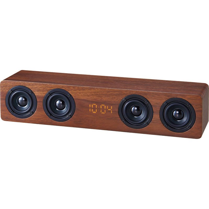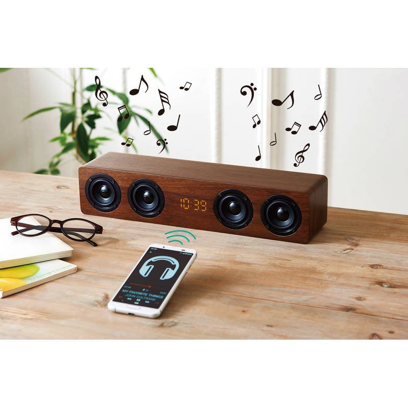 4連のスピーカーから大迫力のサウンドを楽しめるワイヤレススピーカー機能付の時計です。環境に優しいMDFを使用。・アラーム・スヌーズ・カレンダー・TF(microSD)カードスロット・Auxポート